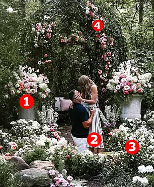 As Travis got down on one knee, the couple were surrounded by incredible arrangements of pink, white, and red flowers under a stunning floral arch.