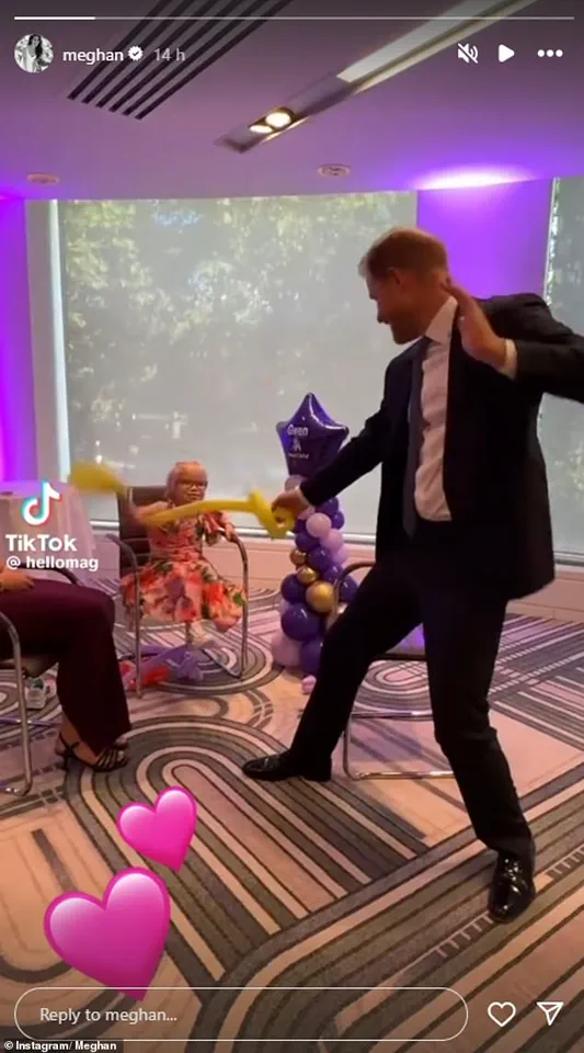 The clip, originally shared by WellChild’s Instagram stories, captured Harry in a lighthearted moment, sword-fighting with balloons against Gwen, who proudly displayed her glittering trainers to the royal.