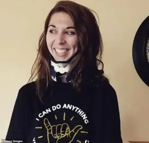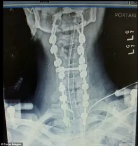 Doctors immediately rushed her into emergency surgery where they fused her skull back onto her spine. ‘It was a horror show,’ King said upon waking. ‘I could not move my head at all.’ She has since endured 37 surgeries total and is now fused from her skull down to her pelvis, effectively immobilizing the movement of her neck.