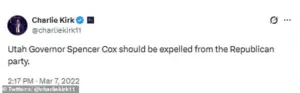 His detractors, including TPUSA founder and Trump ally, branded him a ‘weak moderate’ who ‘should be expelled from the Republican party.’ The tragedy has since become a rallying point for those who see Cox as a traitor to the cause, with some Trump supporters taking to social media to denounce him.