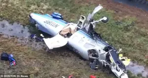 The couple’s plane appeared to split in two, with the fuselage coming to rest on the median while further debris was scattered nearby