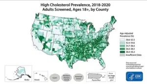 The map shows that concentrations of counties with the highest cholesterol prevalence. Health officials typically advise people to limit their intake of fatty foods, which can influence how much cholesterol the body produces