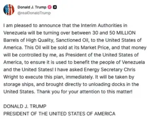 Energy Secretary, Chris Wright, declared that the government would ‘control sales of Venezuelan oil indefinitely,’ ensuring that the oil flows to U.S. refineries and global markets.