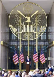 Staff were reportedly given orders by deputy spokesperson John Brown to gather in a show of support behind the new ambassador, with instructions to make sure their cheers were loud and clear as he took the stage. ‘Act like Elvis just walked into the building,’ Brown said, trying to hype up the crowd.
