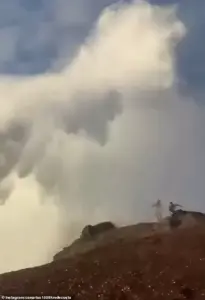 One man stood frozen, staring at the raging waters, while a woman sat beside him, filming the scene with a wide-eyed expression. The group lingered on the ledge despite the rising danger. Then, without warning, a massive wave surged forward, drenching them as they scrambled for safety. The wave hit the platform with a deafening crash, sending a wall of water across the rocks and leaving the tourists scrambling up the slope.