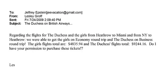 The newly released documents, comprising three million pages, have provided further insight into the extent of Fergie’s entanglement with Epstein. Emails reveal that she once asked Epstein to ‘marry me and then we will employ her’ in reference to a woman described as ‘single and [sic] a great body.’ The documents also detail a trip to the US in 2009, during which Fergie, Epstein, and her daughters Princesses Beatrice and Eugenie met. Epstein’s assistant requested approval for the Yorks’ travel costs, though it remains unclear whether he covered the $15,000 bill for the flights.