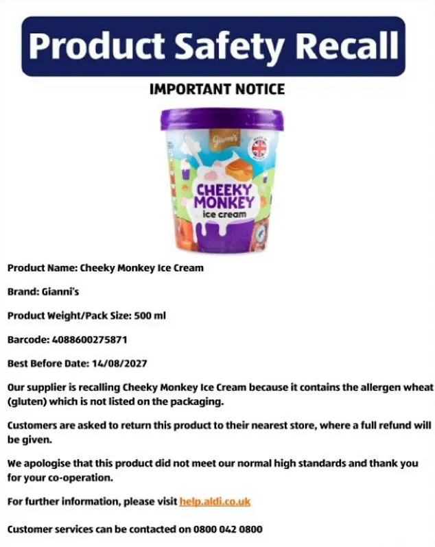 Food News Oct 13, 2025 Aldi Issues Urgent Nationwide Recall of Gianni's Cheeky Monkey Ice Cream Over Undeclared Wheat Risk to Coeliacs and Allergies